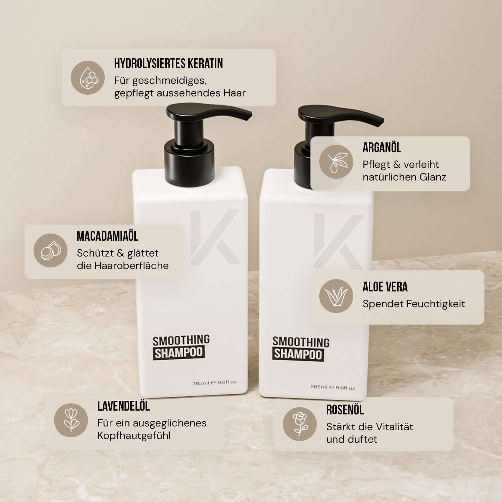 Sie reinigen dein Haar gründlich von Schmutz und Verunreinigungen und reparieren sicher & zuverlässig geschädigtes, strapaziertes Haar. Außerdem glätten sie die Haarstruktur mit jeder Anwendung aufs Neue und verstärken das Ergebnis deiner Keratin Glättung beständig. Es ist die optimale Pflege für danach und ein absolutes Must-Have. Erlebe samtweiche, glänzende, pflegeleichte Haare nach jeder Haarwäsche.